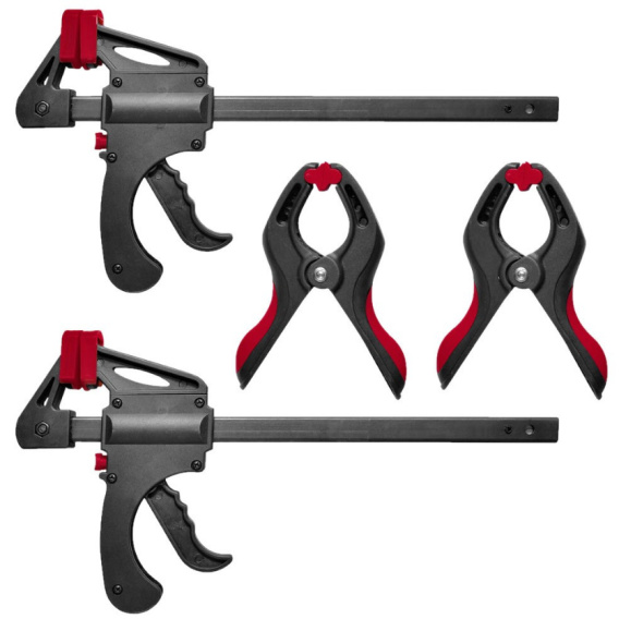 Zestaw zawiera dwa ściski pistoletowe o rozwarciu 100 mm i dwa blokowane ściski do klejenia o rozwarciu 75 mm.