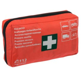 Apteczka pierwszej pomocy spełniająca normę DIN 13164.Opakowanie materiałowe wykonane z wodoodpornej tkaniny w kolorze pomarańczowym. Z tyłu mocowanie na rzepy.