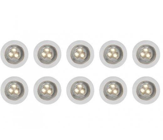 Dziesięć punktowych wpuszczanych lamp LED zatwierdzonych do użytku na zewnątrz pomieszczeń. Do montażu na suficie, ścianach i podłodze.