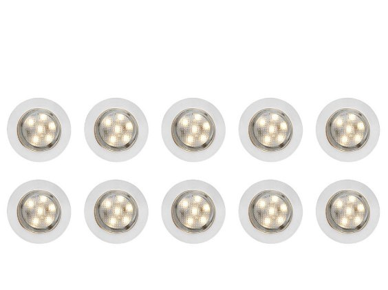 W zestawie transformator 12 V (IP44). Niskie zużycie prądu. Pomiędzy lampami kable o długości 1,5 metra. Wymiary lampy: Ø45x26 mm.