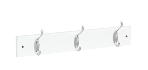 Listwa wieszakowa na bazie płyty drewnianej i metalowych wieszaków z 3 podwójnymi wieszakami.