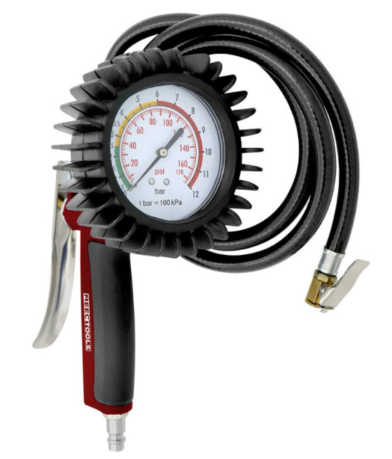 Dzięki manometrowi z dokładną podziałką (0–10 barów) można sprawdzić poziom ciśnienia, co jest szczególnie ważne podczas pompowania opon samochodowych i motocyklowych. Przyłącze 1/4