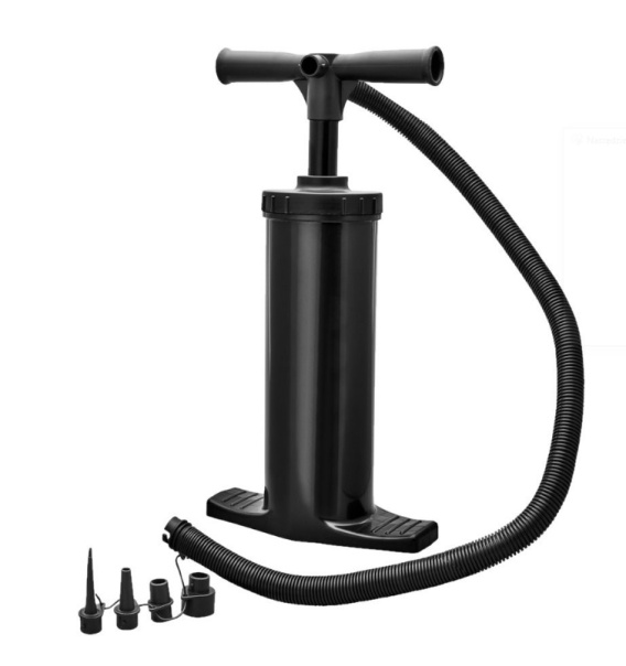 wydajna pompka do pompowania materaców, małych łódek, basenów i dmuchanych zabawek. Z funkcją Double Action, która sprawia, że pompka pompuje powietrze niezależnie od tego, w którą stronę pociągniesz rączkę. Można używać do spuszczania powietrza. W zestawie trzy końcówki do pompowania. Wymiary: Szer:220xWys:450 mm.