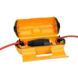 Małe pudełko - sprytne rozwiązanie! Wystarczy umieścić w nim kable i zamknąć pokrywkę, a wtyczka przedłużacza chroniona będzie przed wilgocią i kurzem. Doskonałe do prac w ogrodzie, garażu oraz do przechowywania światełek choinkowych itp. Zamykane pudełko spełnia wymagania stopnia ochrony IP44. Nie należy go jednak zakopywać ani zanurzać w wodzie. Do kabli o średnicy 6,5-10,0 mm. Klasa szczelności: IP44. Wymiary: Dł:206xØ92 mm.