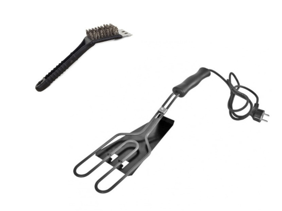 W zestawie statyw do zamontowania na ścianie oraz szczotka do czyszczenia grilla 2w1.