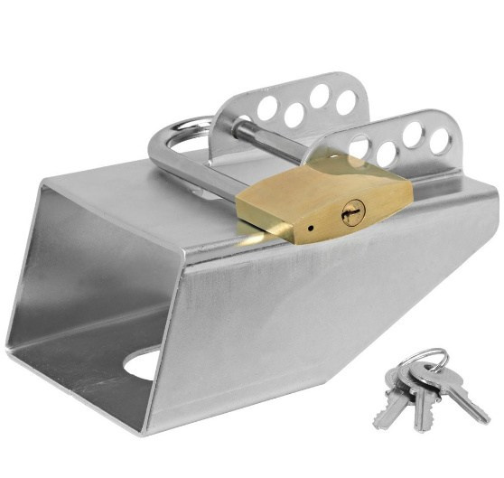 Pomysłowe zabezpieczenie, które może być używane niezależnie od tego, czy przyczepa stoi swobodnie czy jest podłączona do kuli haka holowniczego. W zestawie hartowany zamek i trzy klucze.