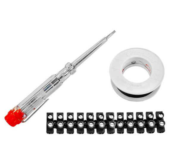 Zestaw do instalacji elektrycznych składający się z testera napięcia, taśmy izolacyjnej i złączy.