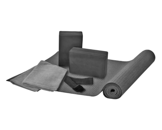 Wszystko, czego potrzebujesz, aby ćwiczyć jogę w domu! Zestaw zawiera matę, dwa klocki, dwa małe ręczniki oraz taśmę do jogi.