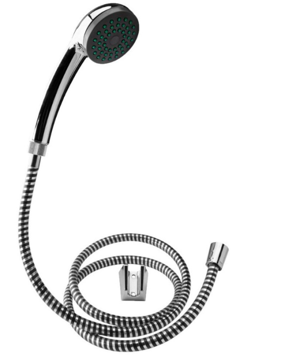 Zestaw zawiera słuchawkę prysznicową, wąż oraz uchwyt ścienny na słuchawkę. Słuchawka prysznicowa jest wykonana z chromowanego tworzywa i oferuje funkcję automatycznego usuwania kamienia (gumowe nasadki odpychające kamień), jeden rodzaj strumienia oraz głowicę natryskową o średnicy 7 cm. Wąż ma długość 150 cm i jest wykonany z tworzywa PVC. Przyłącze baterii (R15) wykonano ze stali nierdzewnej, a przyłącze słuchawki z chromowanego tworzywa. Dzięki dołączonemu uchwytowi ściennemu nie trzeba trzymać słuchawki przez cały czas. Słuchawkę można umieścić w uchwycie w dwóch położeniach. W zestawie dwa wkręty, dwa kołki rozporowe i dwie uszczelki.